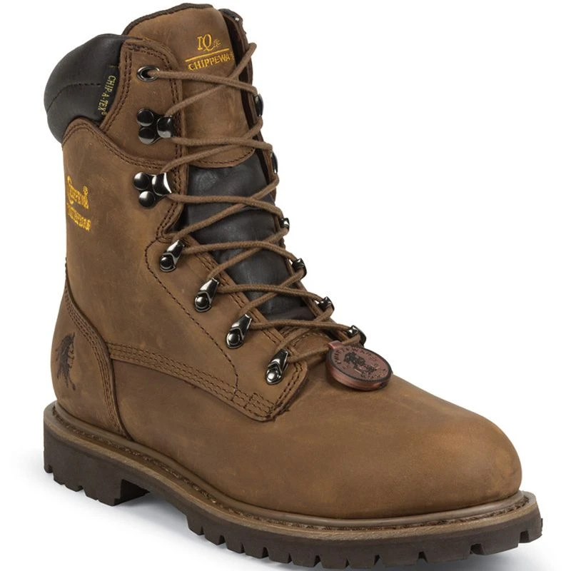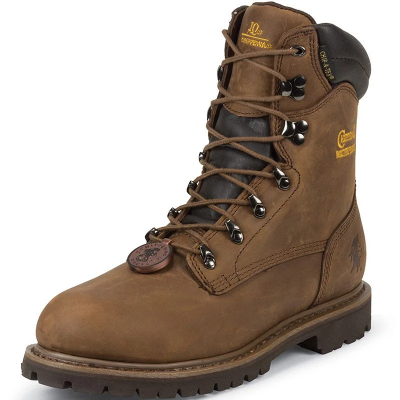 This Men’s Chippewa 8in Heavy Duty Tough Bark Waterproof Insulation Steel Toe Boot is a good waterproof outdoor boot with a steel toe. This boot features goodyear welt/chip-a-tex waterproof bootie construction, chippewa/Q rubber outsole, non tarnishable hardware, 4oo grams of 3M thinsulate ultra insulation, and ASTM electrical hazard rated.