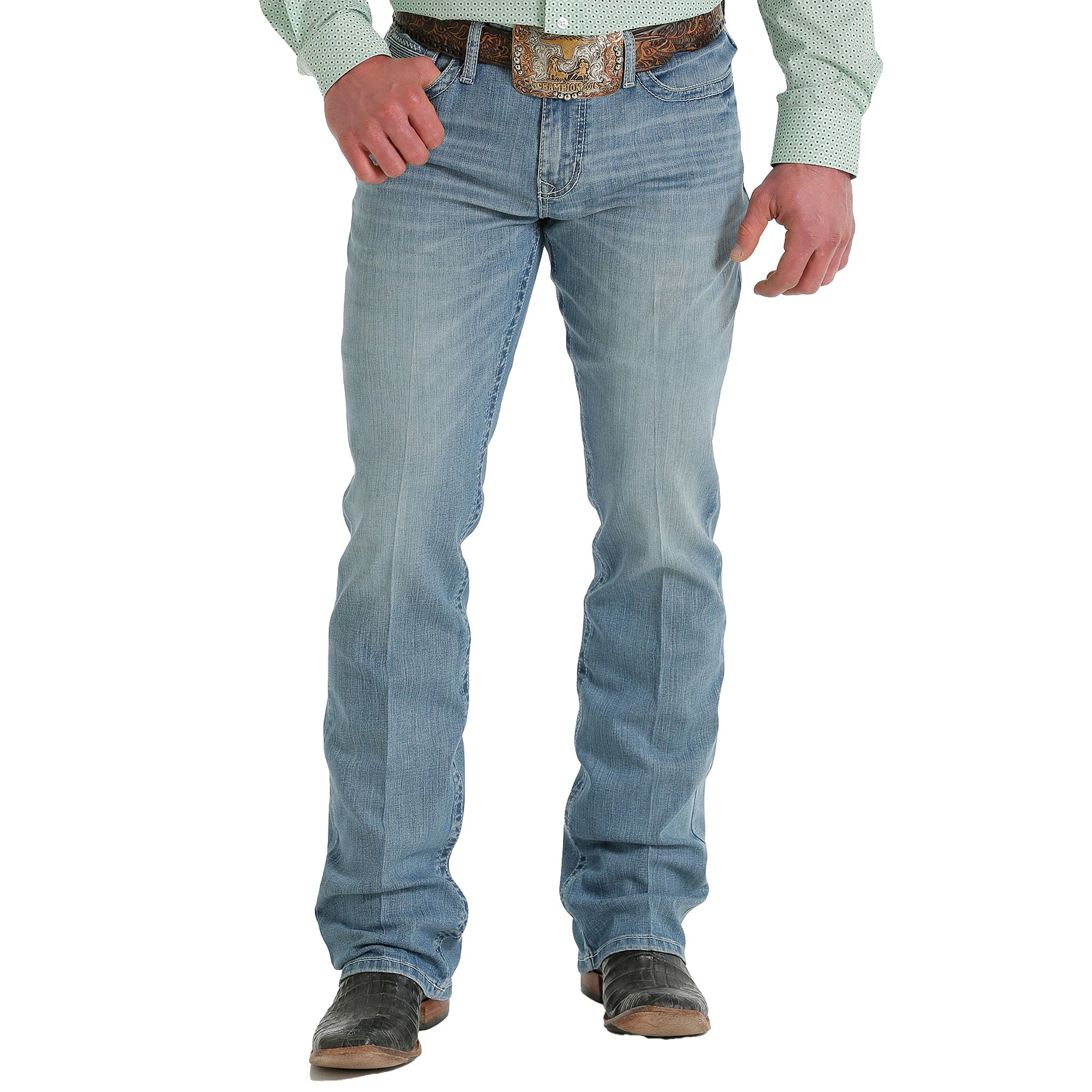 Celebrate the summer season in our cool acid washed IAN. A right-hand broken twill performance denim is finished with heavy hand sanding, whiskers, chevrons and grinding. Subtle back pocket embroidery and triple-needle cord stitching add to the youthful look.