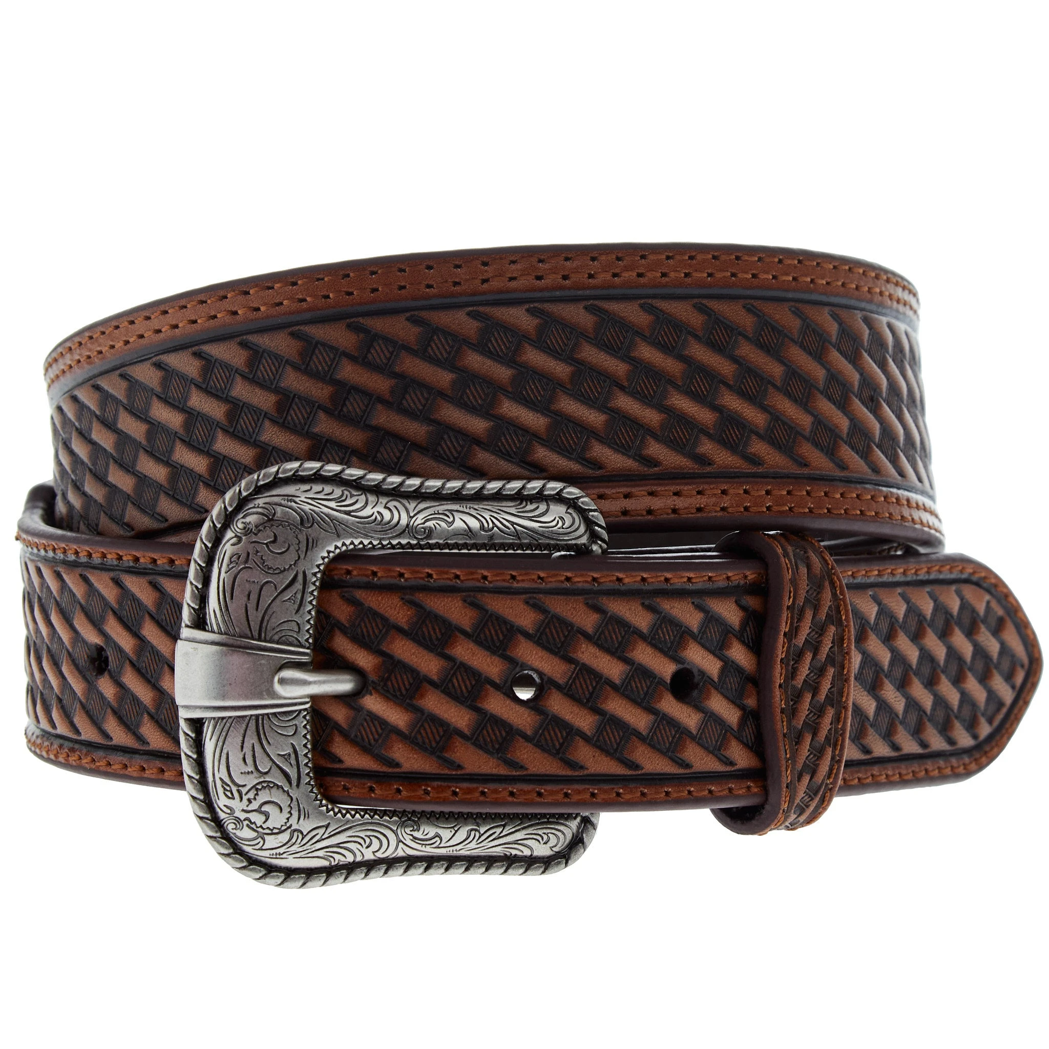 This tapered JP West belt features basketweave tooling and a removable antique finish nickel buckle.