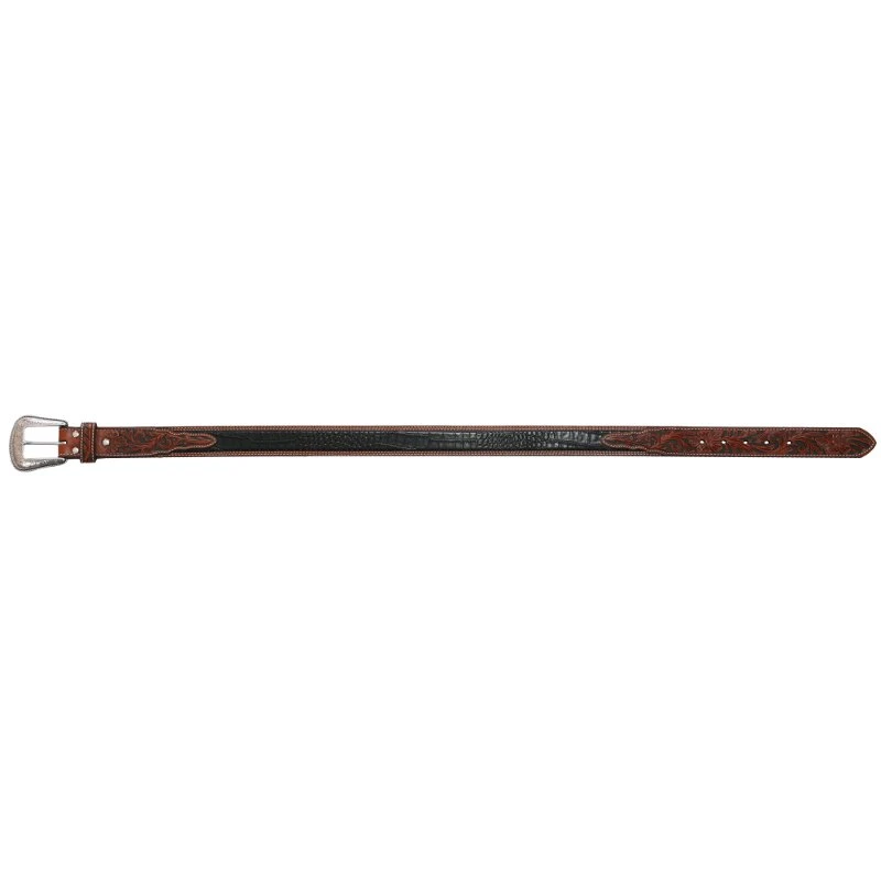 This Men’s Gator Tooled Brown and Black Belt is1 1/2″ wide. There is a floral engraved buckle and leather keeper.