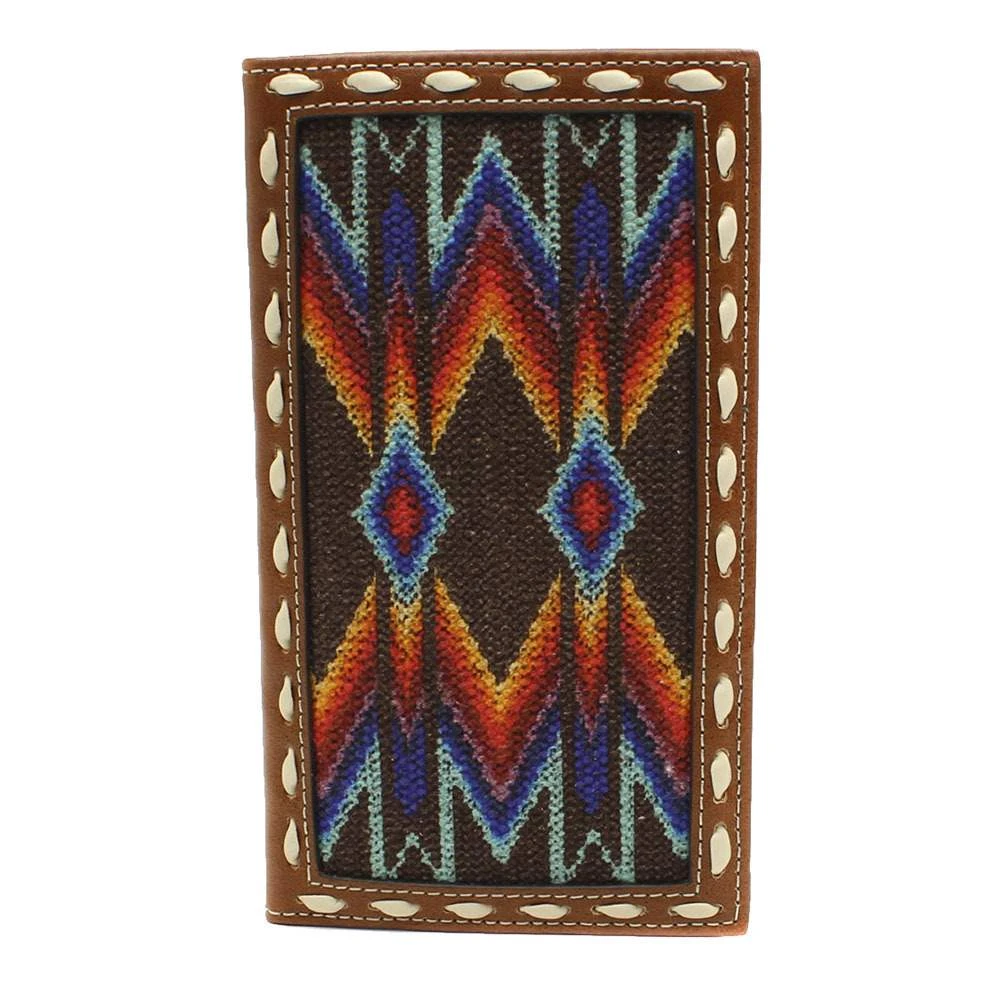 This Men’s Nocona Wallet is crafted with genuine top-grain leather. The slim bifold wallet features a colorful Aztec inlay on thick textiles, plus an ivory whipstitch around the trim, stores all of your essential credit cards, cash, and a checkbook and also comes with removable photo sleeves.