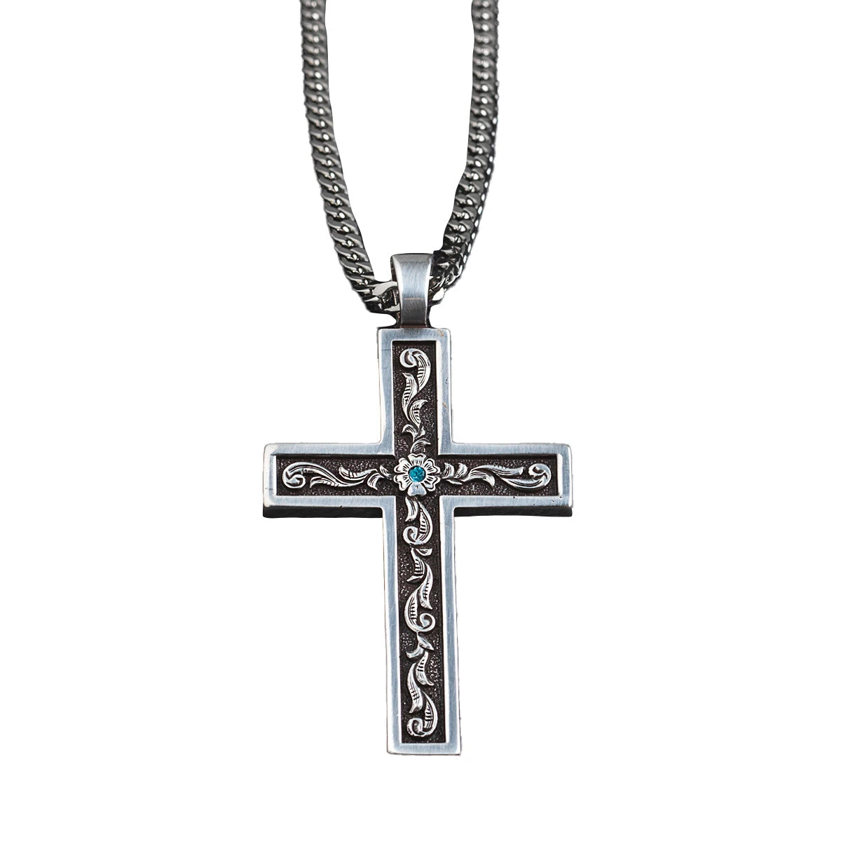 Twister cross pendant necklace from M&F featuring floral tooling and an aqua stone.