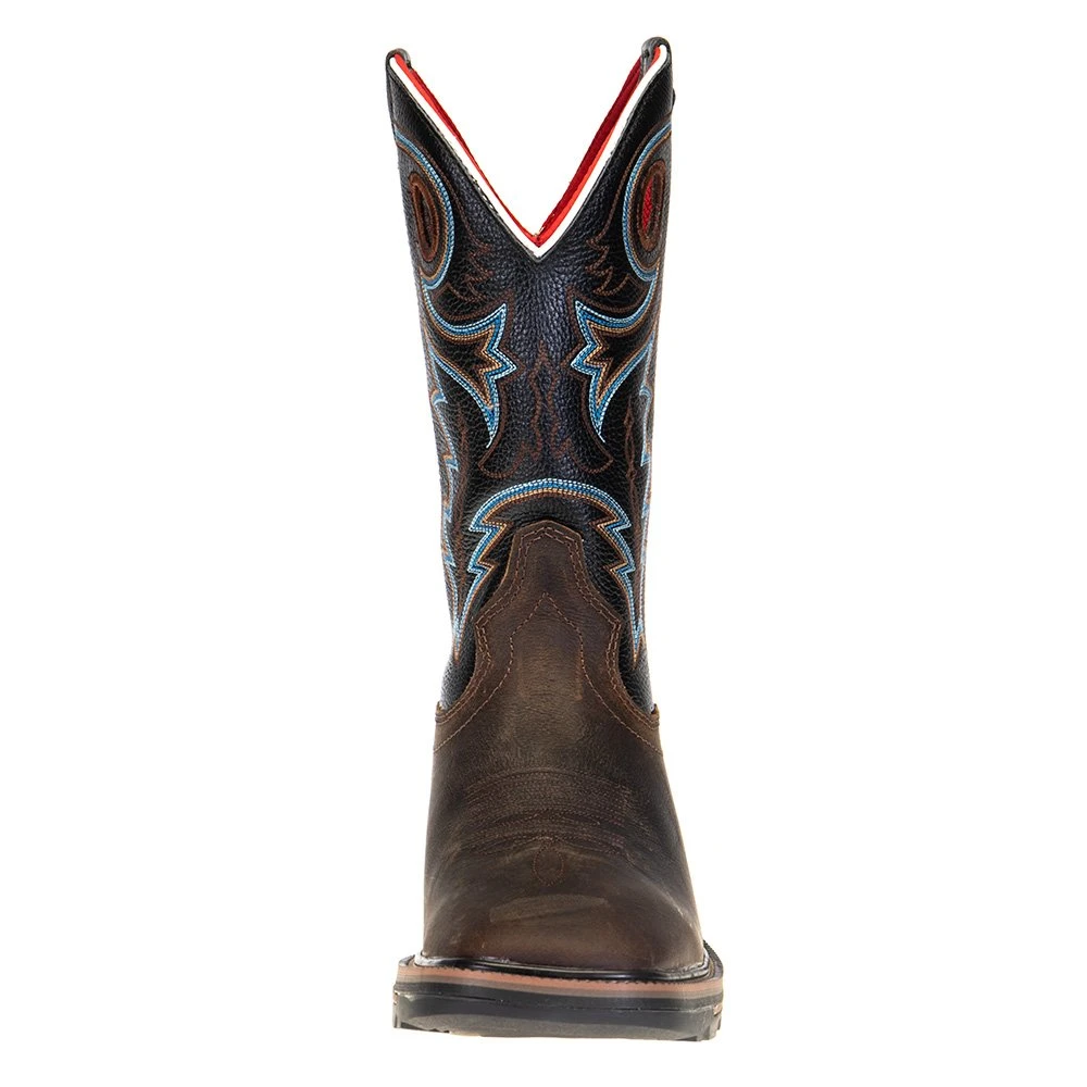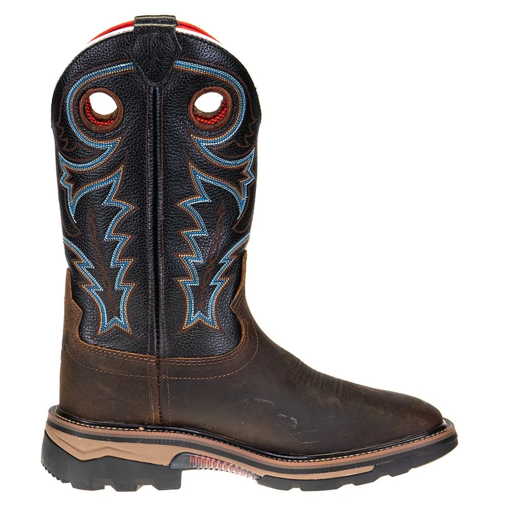 R. Watson presents these coffee distressed buffalo and midnight black goat top soft toe work boots. These work boots have a 10 row stitch pattern, pull holes, removable orthotic insole, EVA midsole and a block heel. They are EH, slip and oil resistant. 12″ total in height.