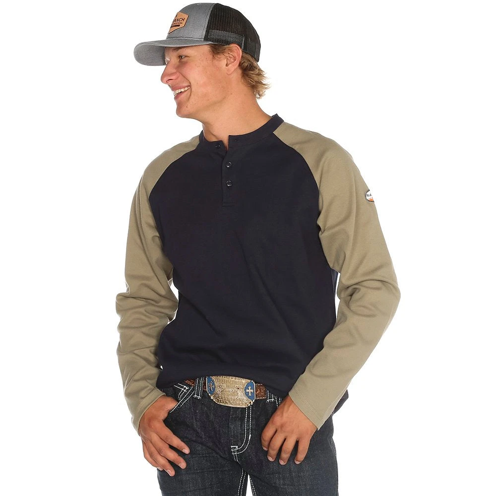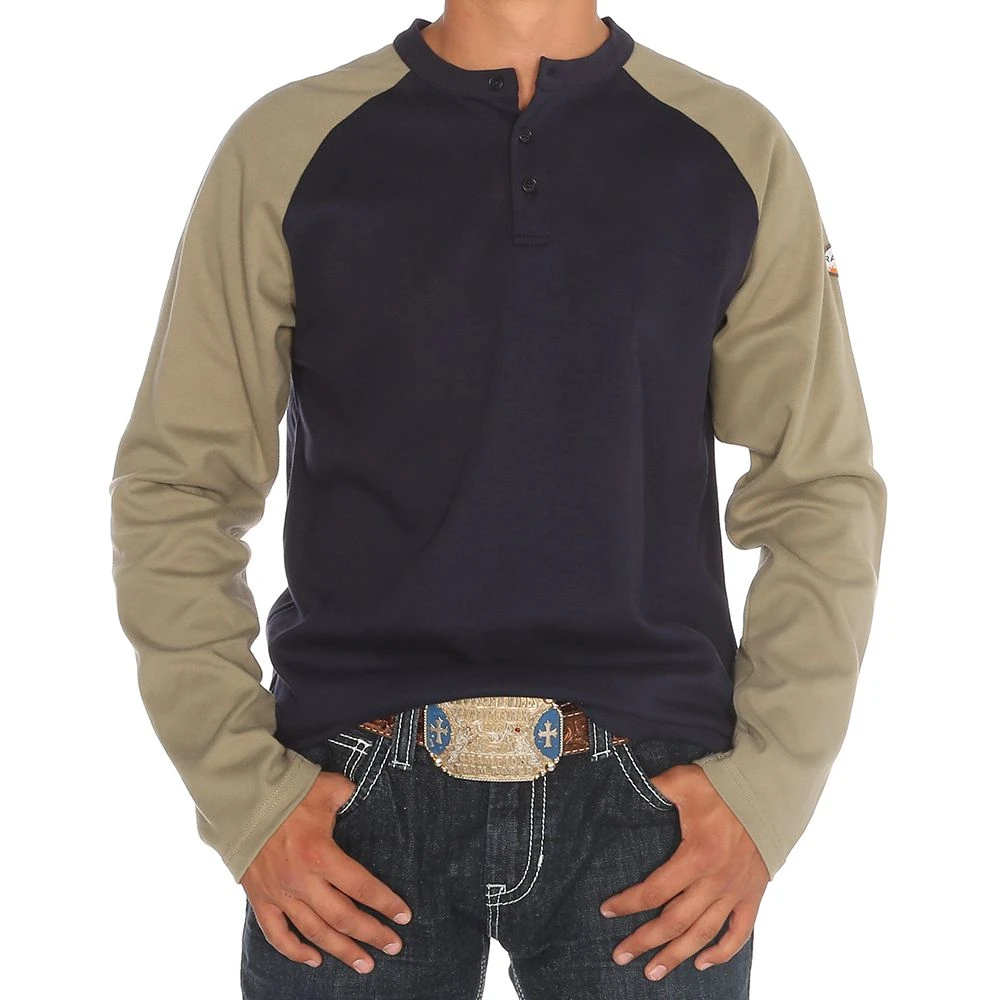 Work safely and look great in this khaki and navy Henley shirt from Rasco FR.