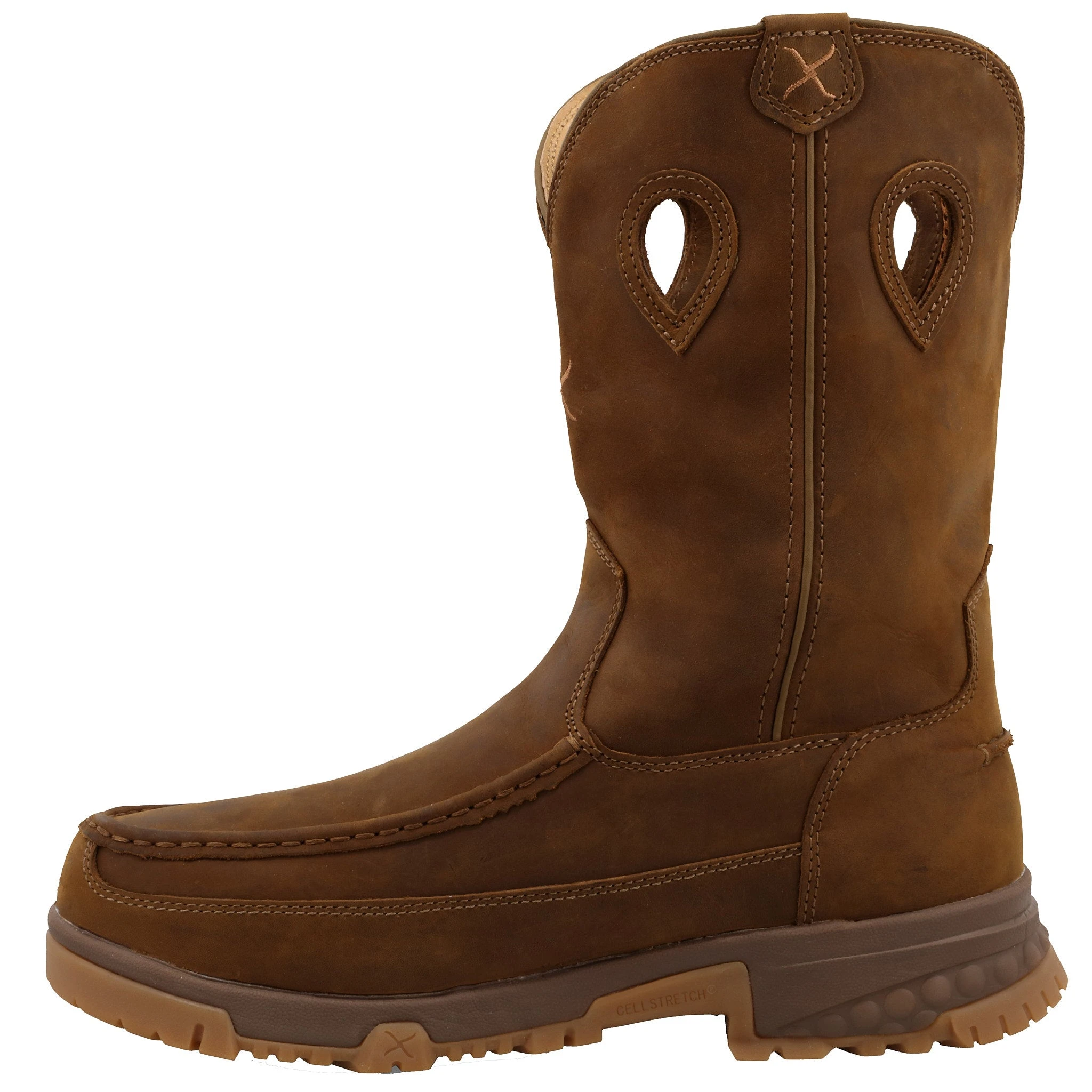 The Men’s 11″ Nano Composite Safety Toe Pull-On Work Boot with MetGuard?¢ was made for serious comfort. Handcrafted in full-grain leather, this boot features a Nano Composite Safety Toe. For stability and durability, Twisted X® has combined a combined a compression-molded sugar cane molasses EVA midsole with integrated Twisted X® CellStretch® comfort technology and a nylon/glass fiber shank. The oil and slip resistant molded rubber outsole provides durability and improved traction for whatever your day may bring. Twisted X® Work footwear provides all the comfort, stability, and durability that you need to outperform any demanding work environment.