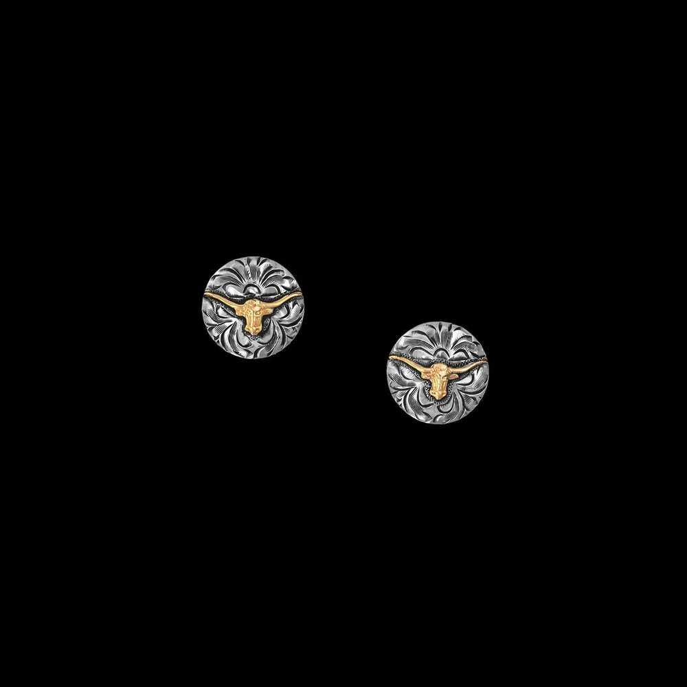 14 karat gold fill longhorns set on a hand engraved 3/4″ domed sterling cufflink. Fully engraved, flat disc post backs.